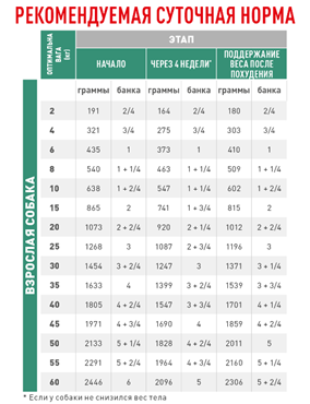До назначения диеты необходимо определить оптимальный вес тела собаки с учетом индивидуальных особенностей и стандартов породы. В соответствии с оптимальным весом определяется суточная норма, которую может изменять ветеринарный врач на основе скорости снижения веса. Оптимальное снижение веса в первые 3 месяца - 1-3% в неделю и 0,5-2% в неделю в дальнейшем.Как рассчитывается распределение энергии для поддержания веса после похудения?Энергетические потребности для поддержания веса тела после похудения ниже, чем у собак, которые никогда не имели лишнего веса. Опираясь на современные научные данные (German & al.2011 / Германия и другие), рацион для поддержания веса после похудения рассчитывается путем увеличения на 10% рациона для снижения веса.Помните, что животному следует обеспечить постоянный доступ к питьевой воде.